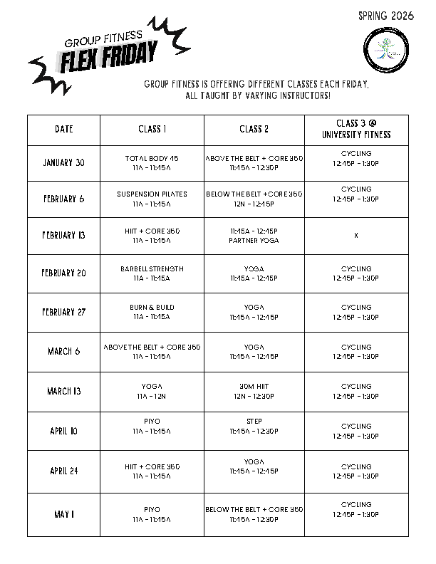 Join the Group Fitness instructor team for different classes each Friday throughout the semester, all taught by varying instructors! We'd LOVE to see you!